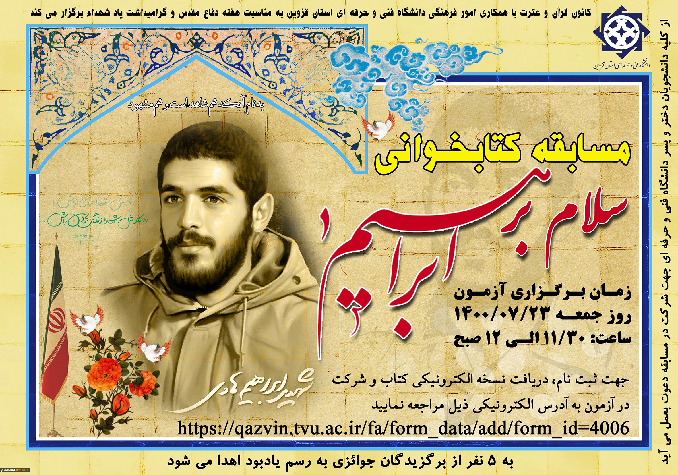 امتیاز دهید : شرکت در مسابقه کتابخوانی مجازی به مناسبت هفته دفاع مقدس با موضوع سلام بر ابراهیم در روز جمعه مورخ 1400/07/23 از ساعت 11:30 لغایت 12 2 یکشنبه 18 مهر 1400 ساعت 13:44