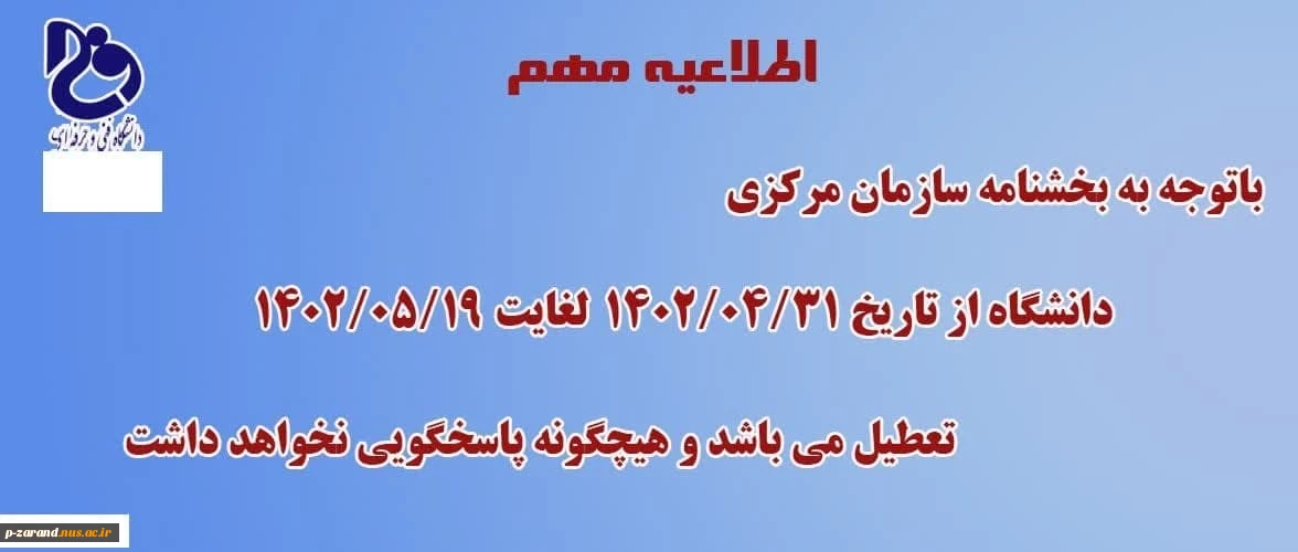امتیاز دهید : اطلاعیه مهم با توجه به بخشنامه سازمان مرکزی آموزشکده زرند از تاریخ سی ویکم تیرماه لغایت نوزدهم مردادماه تعطیل می باشد و هیچگونه پاسخگویی نخواهد داشت 2 چهارشنبه 28 تیر 1402 ساعت 10:07